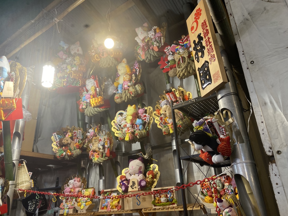 現代的なデザインのお店も多く、猫をあしらったかわいらしい熊手もありました。
