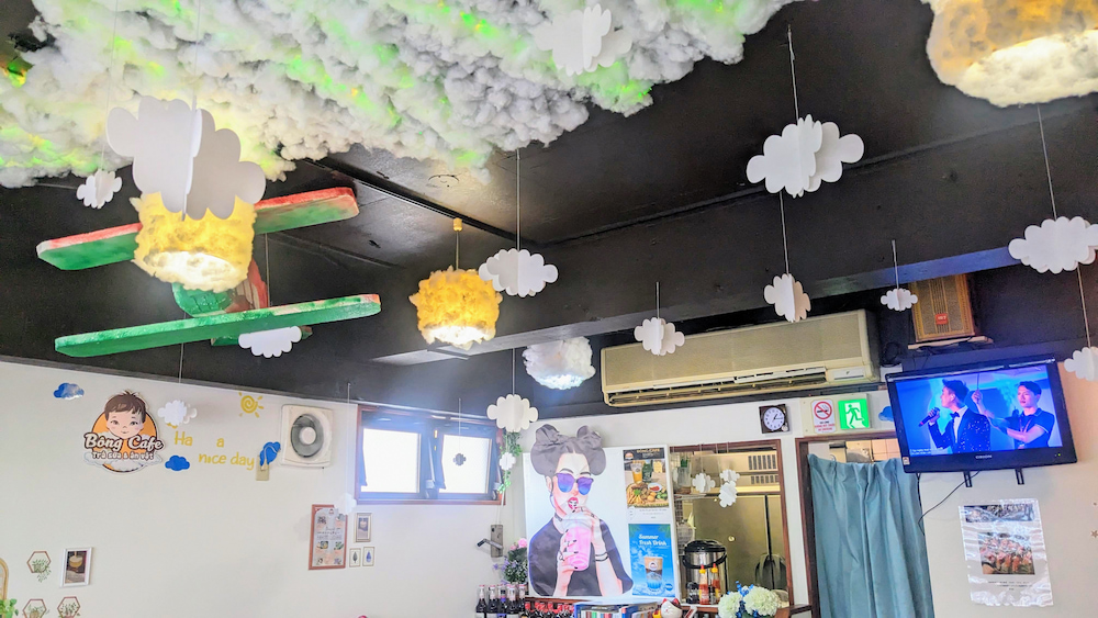 店内は壁や天井にまで飾りが付けられています。空に飛行機が飛んでいるようで、とてもファンシー!テレビではベトナムの音楽が流れていました。