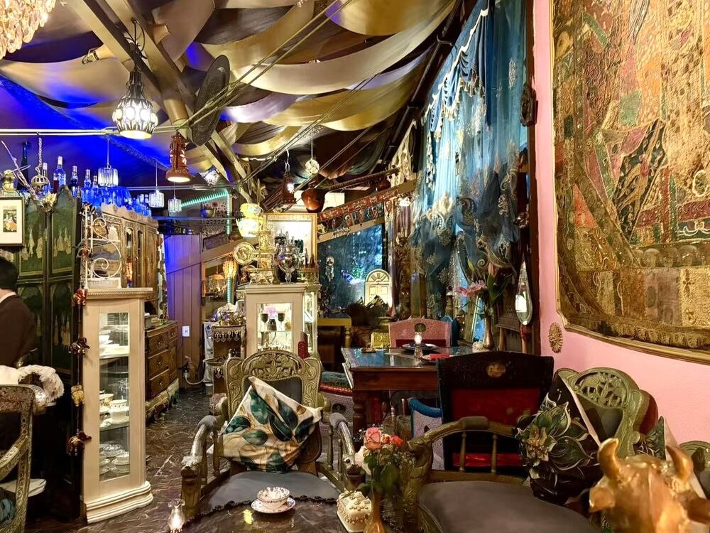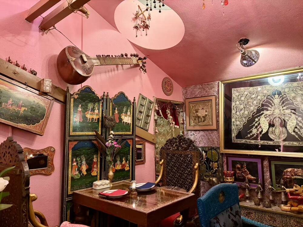 天井から吊り下げられた数々のきらめく照明やかわいいランプ、美しい装飾が施された壁面の店内は、まさにインドの王宮に迷い込んだかのような世界観です。