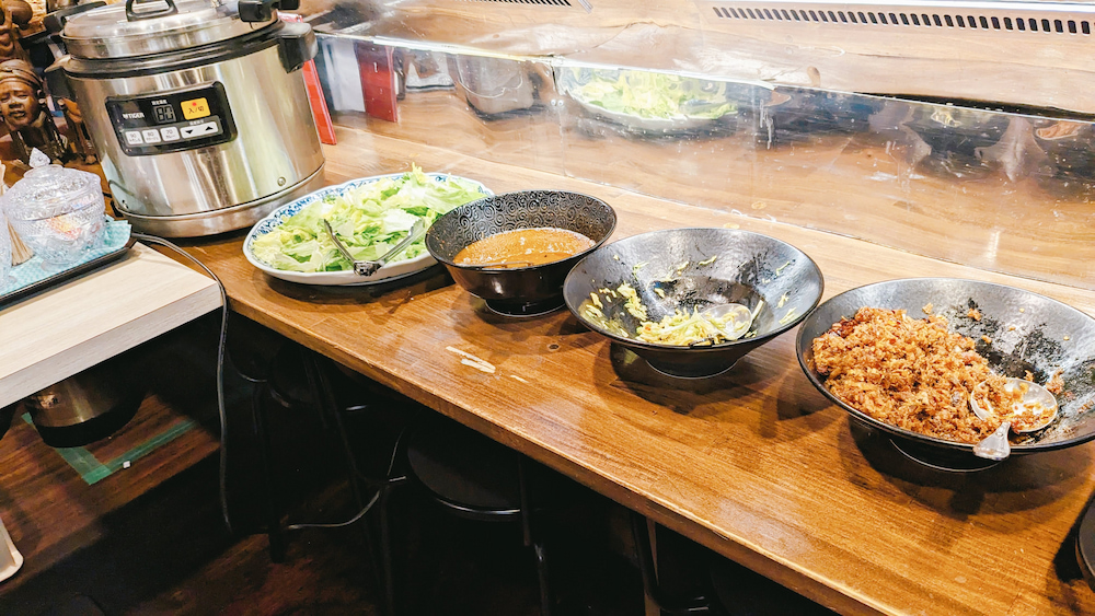 副菜にはサラダやソース、スープなどが並びます。店員さんはミャンマー出身の方で、初めてだと伝えると流暢な日本語で丁寧にメニューの説明をしてくれました。