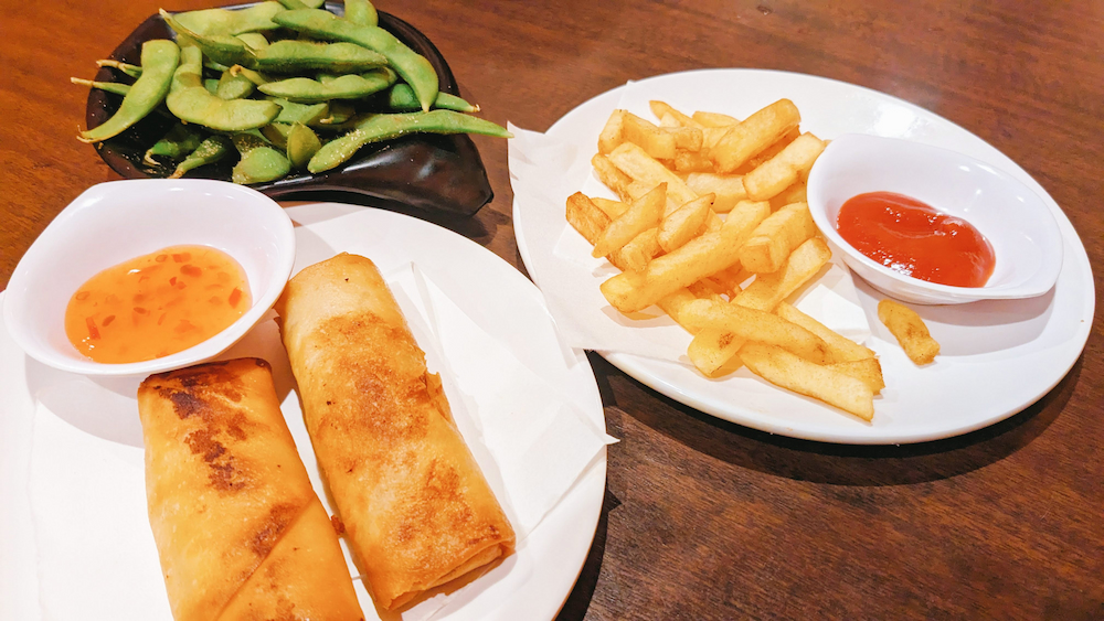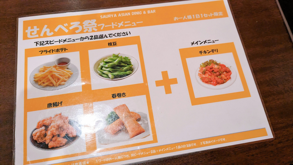 せんべろ祭のメニューはフライドポテト、枝豆、唐揚げ、春巻きの4品のなかから2品。メインメニューとしてチキンチリが付きます。1人で行っても3品+ドリンク1杯が付いて1,000円とはお得。