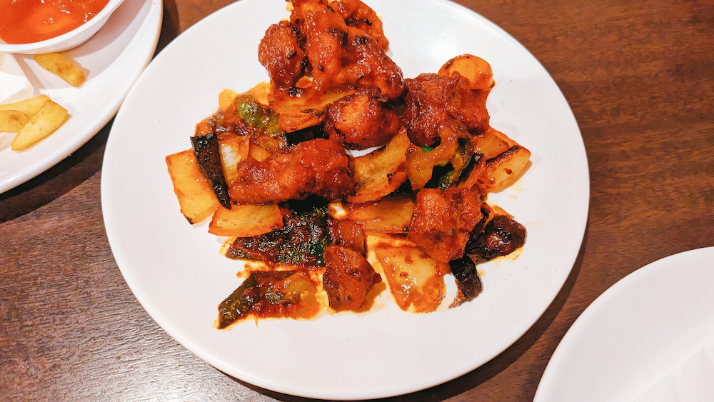 メインメニューのチキンチリ(写真は2人分)は、アジアンダイニングらしいスパイシーな味付け。ピリッと辛味が効いていて、ちびちびとお酒を呑むのにぴったり。