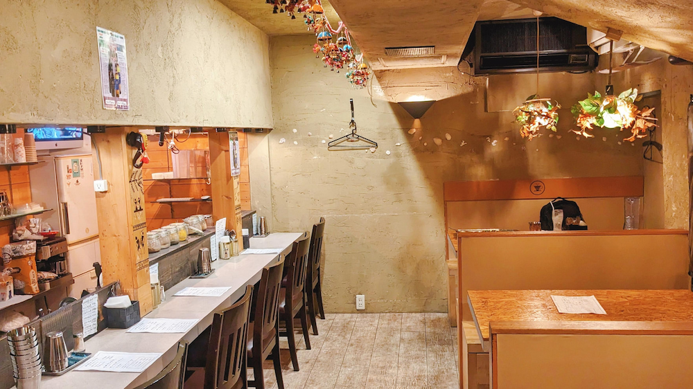 カウンター席と、テーブル席が3つあり、1人でも複数人でも利用しやすいつくりです。暖色系のライトが、落ち着きます。