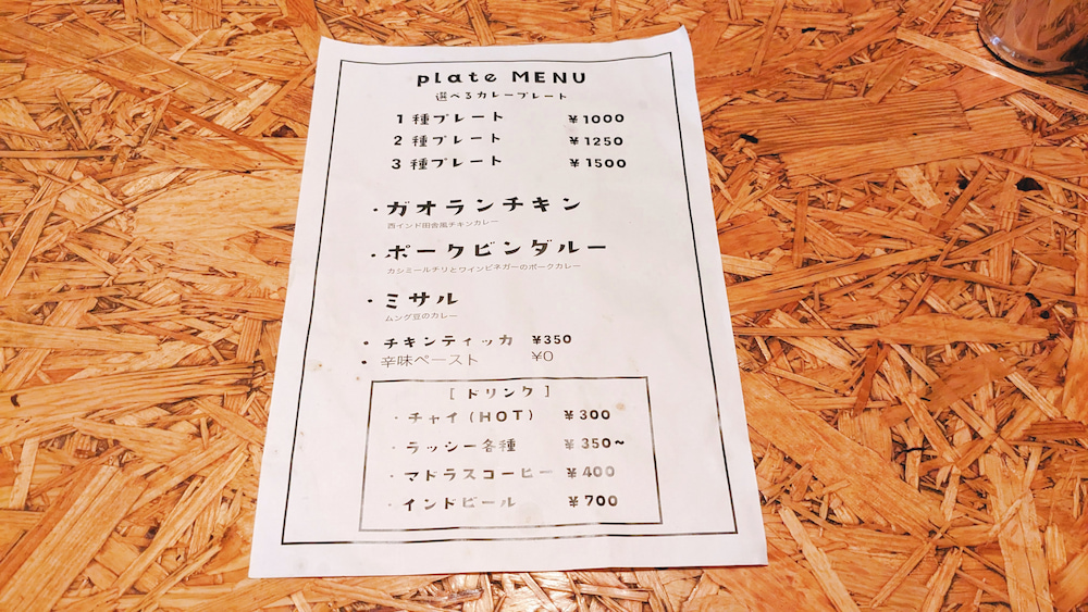 メインメニューは1種〜3種のカレープレートを選ぶ、とてもシンプルなスタイル。