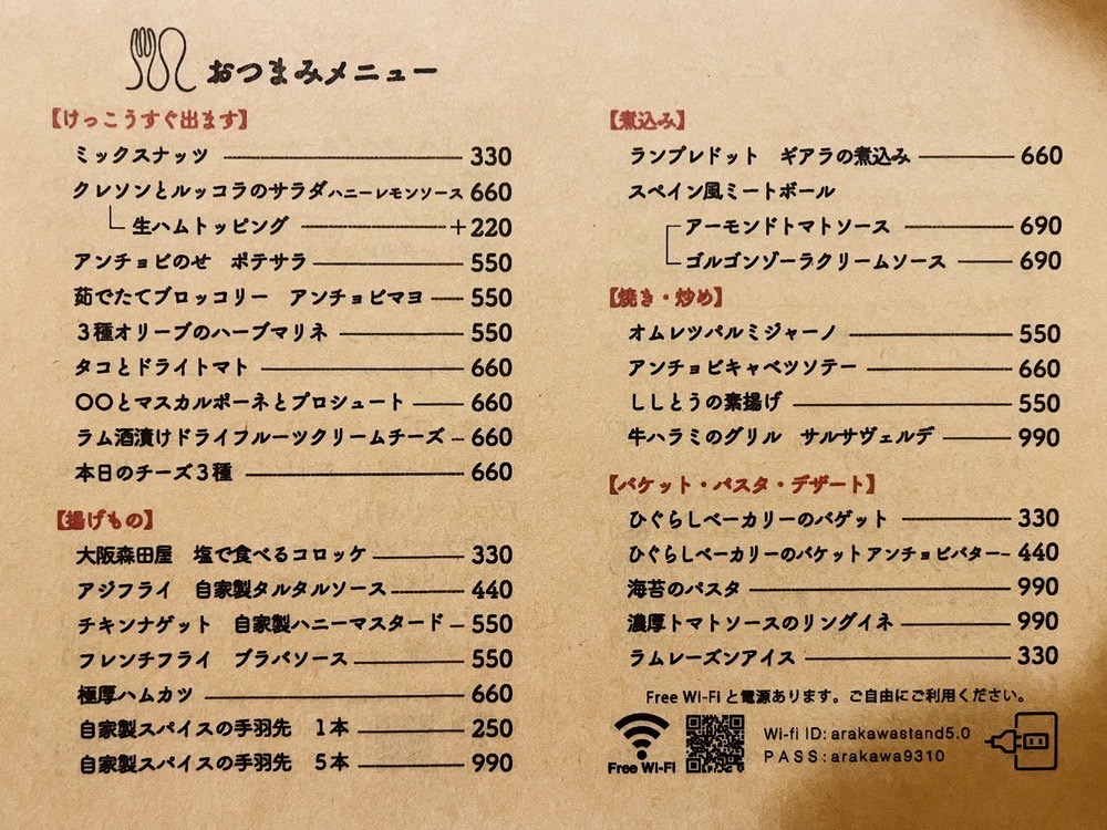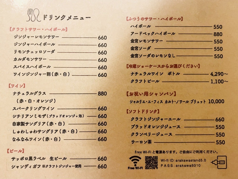 おいしいドリンクとおつまみがリーズナブルに楽しめる、荒川STAND。