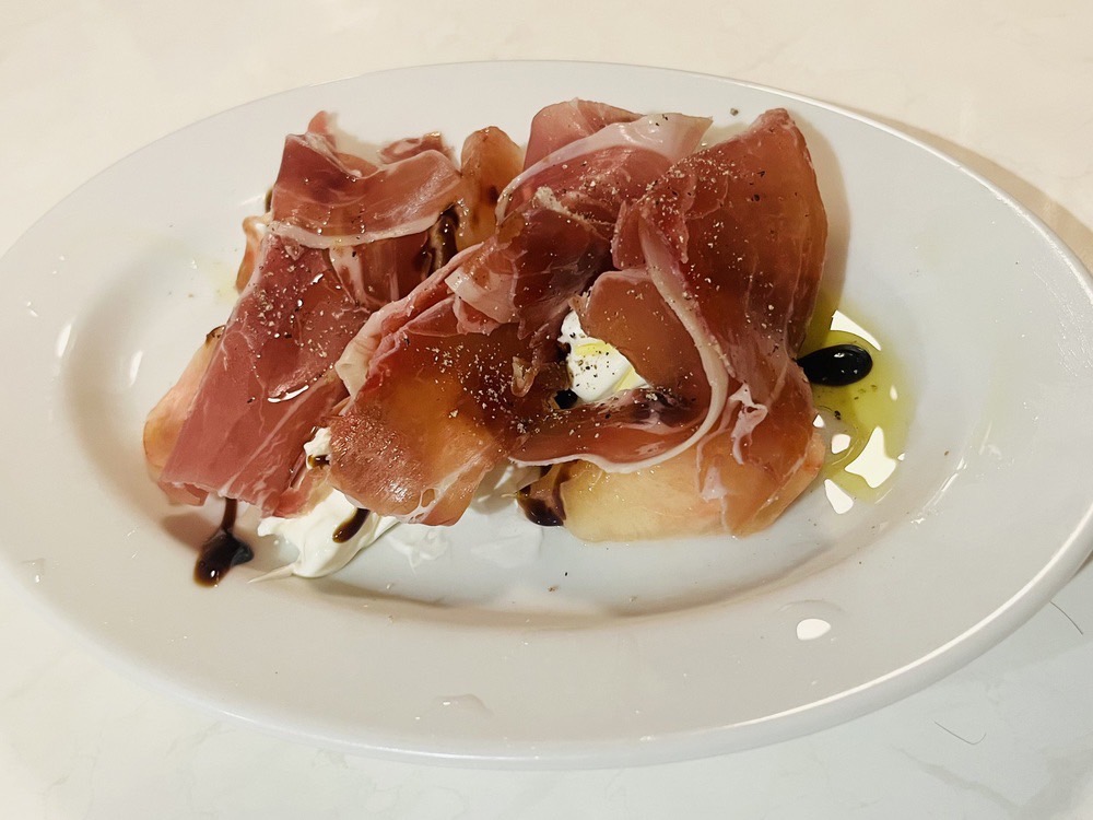 フルーツとマスカルポーネ、プロシュートに、オリーブオイルとバルサミコ酢の酸味のバランスが抜群で、とにかくワインが進むおつまみです。