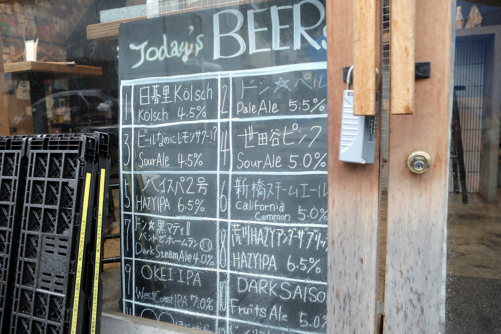 店はガラス張りになっていて店内の様子がわかるつくりになっています。本日のビールの種類が書き込まれた黒板が置いてあったり、店内の混雑具合も一目瞭然。