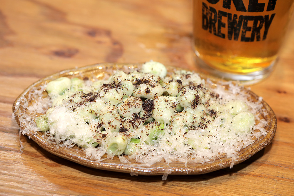 たっぷりとチーズが散りばめられていて、そらまめの熱さでとろけるチーズと化していました。小粒で皮つきなので口に入れた感じは大きなグリーンピースといったところ。ぷちぷちとした食感がとてもおもしろいです。