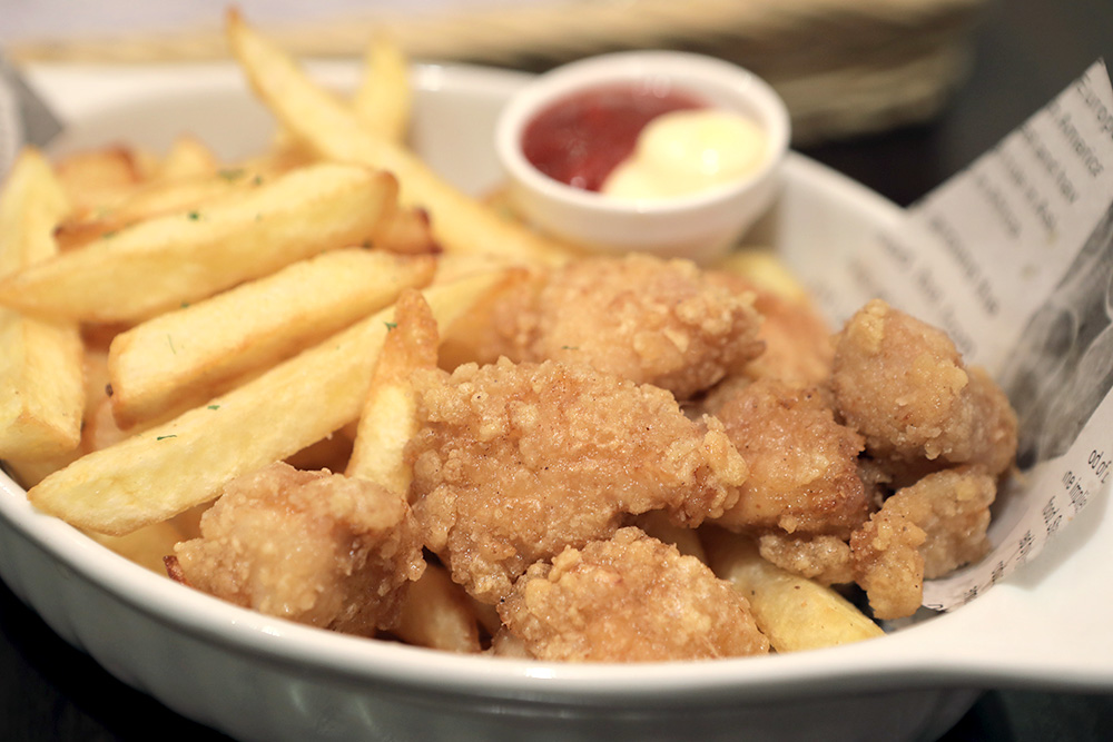 チキンバスケットは、熱々の唐揚げとポテトが楽しめる一皿。