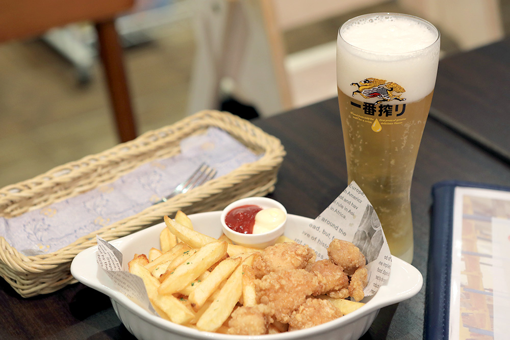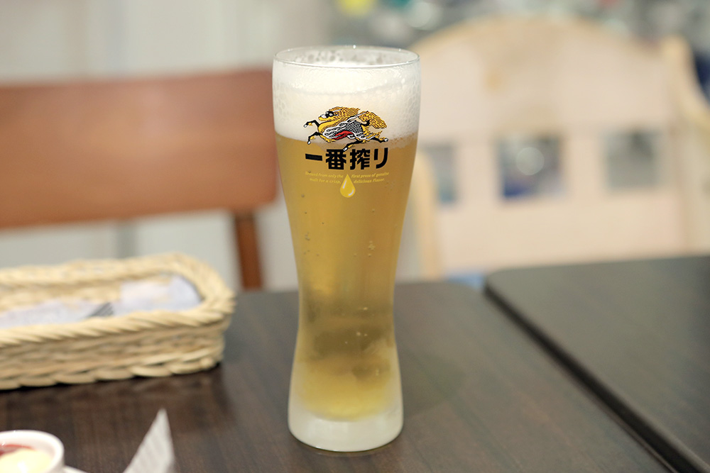 生ビールはキリン一番搾り。グラスに入っての提供で、価格は税抜きで650円。アルコールドリンクはほかに、ハイボールとレモンサワーなどが用意されています。