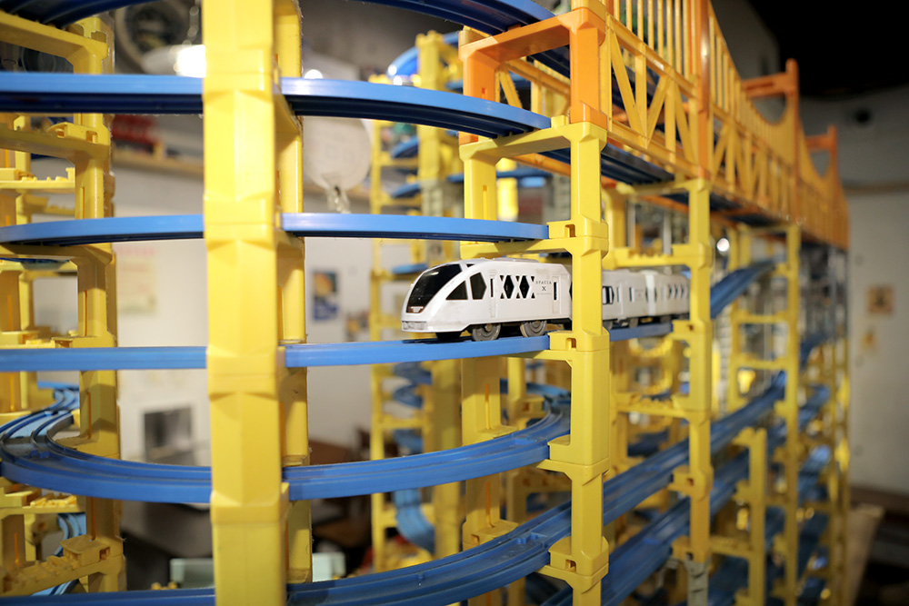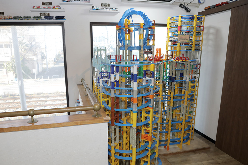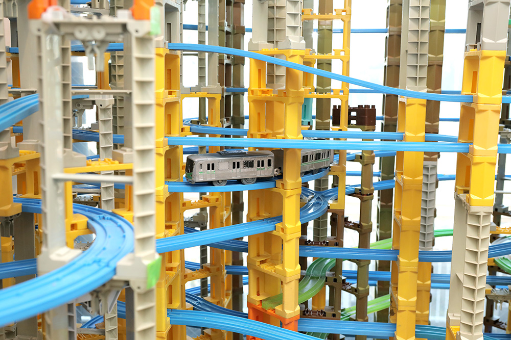 そして眼前に広がる巨大なスケールで組み立てられたプラレールの線路。何層にも高く積まれた線路の上を常時10両の列車が走っています。