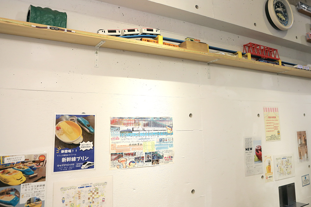 壁の上部に設けられた棚にもプラレールの列車が走っていたり、壁に電車関連のグッズが飾られていたりと、電車尽くしの店内は圧巻の一言。家族連れのお客さんの子供たちがはしゃいでいるのもうなづける雰囲気を醸し出しています。
