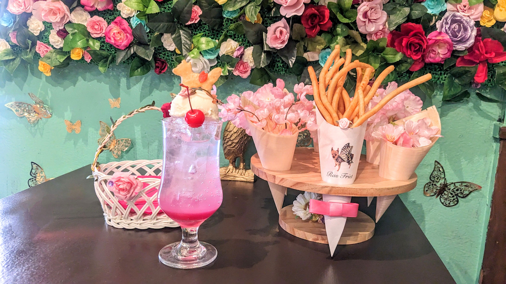 続いて運ばれてきたのはSAKURA CREAM SODA。ピンク色がとても鮮やかで桜満開のラスポテトと一緒に見るとお花見気分です。