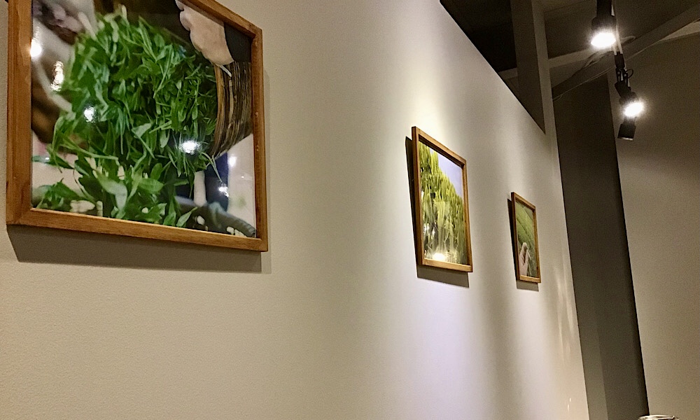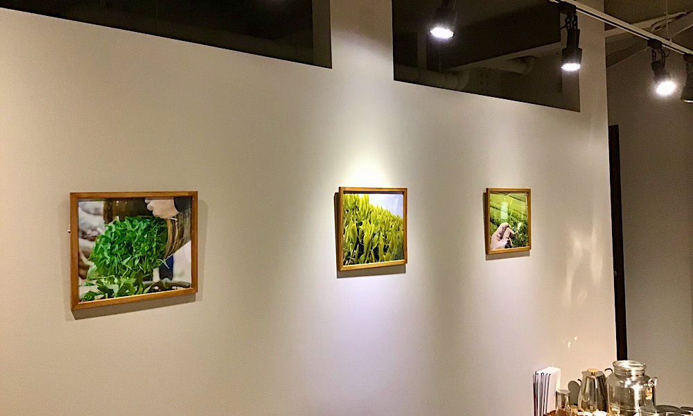 茶葉のふるさとをおさめた写真も、スポット照明に映えています。紅茶になる茶葉も、最初はみずみずしい緑色なのですね。