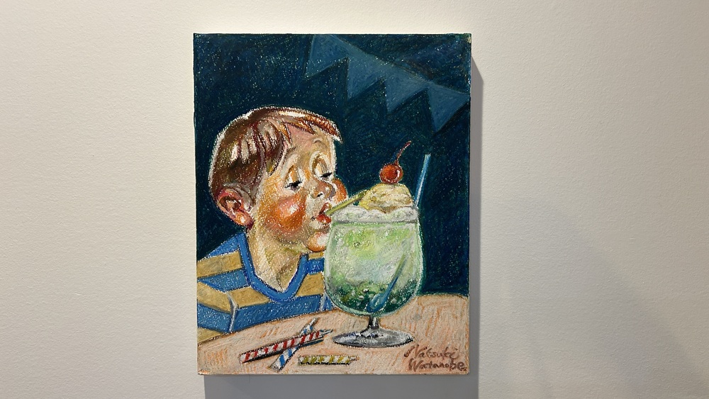 入口の窓ガラスにあったクレヨン画は、東京芸大出身のクレヨンアーティスト渡邉菜月さんによるものだそうです。渡邉さんは、台東区内のセレクトショップやカフェで個展を開くなど活動されており、窓ガラスのクレヨン画は、なんと営業中にライブアートで制作したのだとか。店内にも渡邉さんの作品が飾られています。オールドアメリカンのノスタルジックな作風が、お店のやわらかな雰囲気にピッタリです。