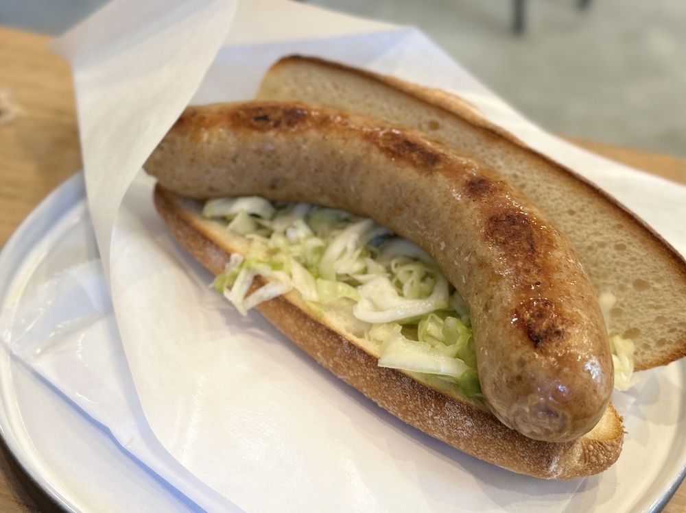 パンからはみ出るほどビックサイズの極太ソーセージと、ザワークラウトのキャベツがたっぷりサンドされています。こんがりきれいな焼き色で、手に持つとアツアツ、焼きたての香ばしいかおりがふんわりと広がります。