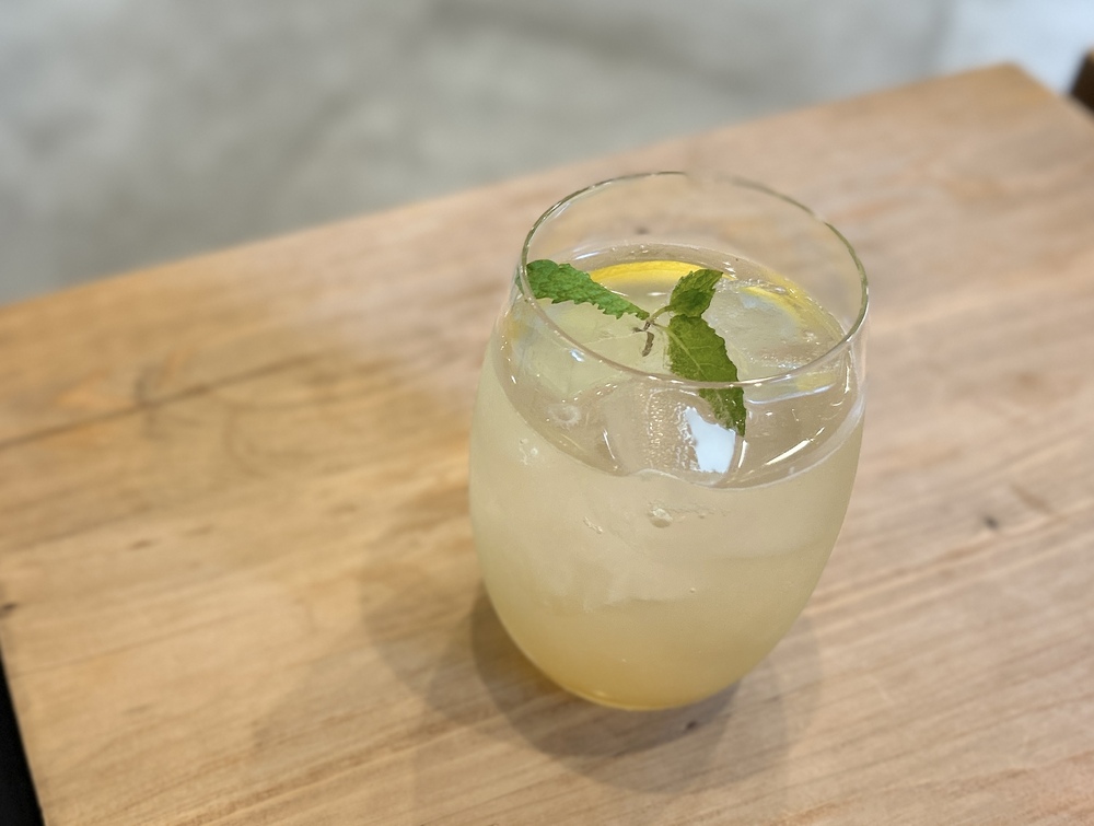 白ワイン仕込みという自家製レモネードはとても爽やかな味。アルコールは飛ばしてあり、マスカットの甘味とレモンの酸味、ミントのほんのりした香りを楽しめる、甘さ控えめのドリンクです。