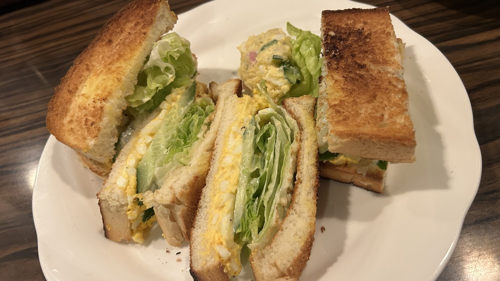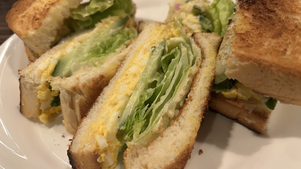 続いてタマゴサンドです。テーブルに置かれて、その大きさにびっくりしました。こんがり焼かれた山型食パン2枚に、具材がたっぷりサンドされています。レタスの量がすごい!