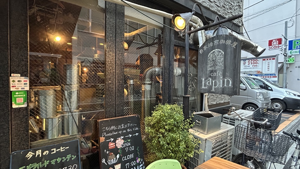 赤い張り出しテントの右側に、木の看板がかかっています。その向こう側には、コーヒー豆の焙煎機がガラス越しに見えます。