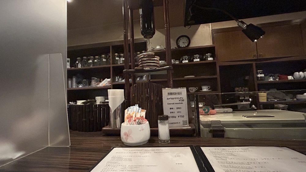 この日はカウンター席を利用しました。幅の広いカウンターテーブルで気持ち良いです。目の前にはスロードリップブリュワーがあります。水出しコーヒーをゆっくり落ちる水滴でつくる器具です。とてもおしゃれですね。