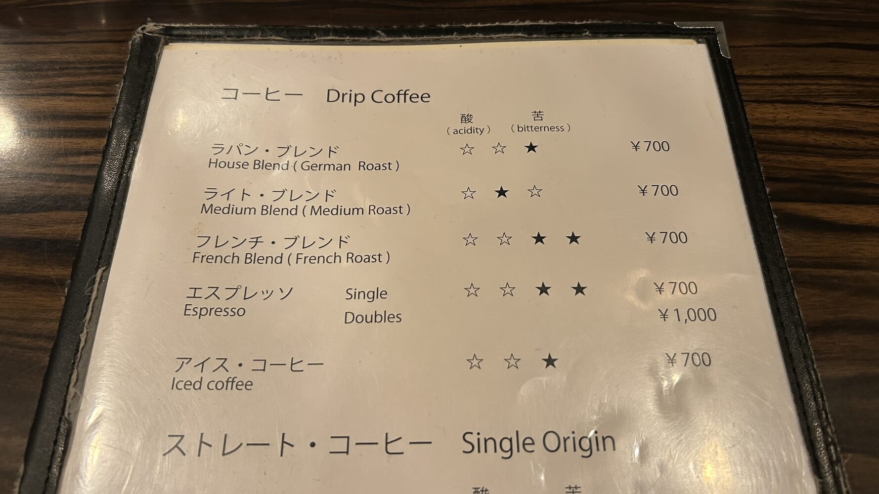 酸味と苦みのランク付けがされているので選びやすいです。このほかにシングルオリジン(1種類のコーヒー豆で淹れるもの)もありました。他にも、キリマンジャロやブラジル、グアテマラなど有名なコーヒーが揃っています。