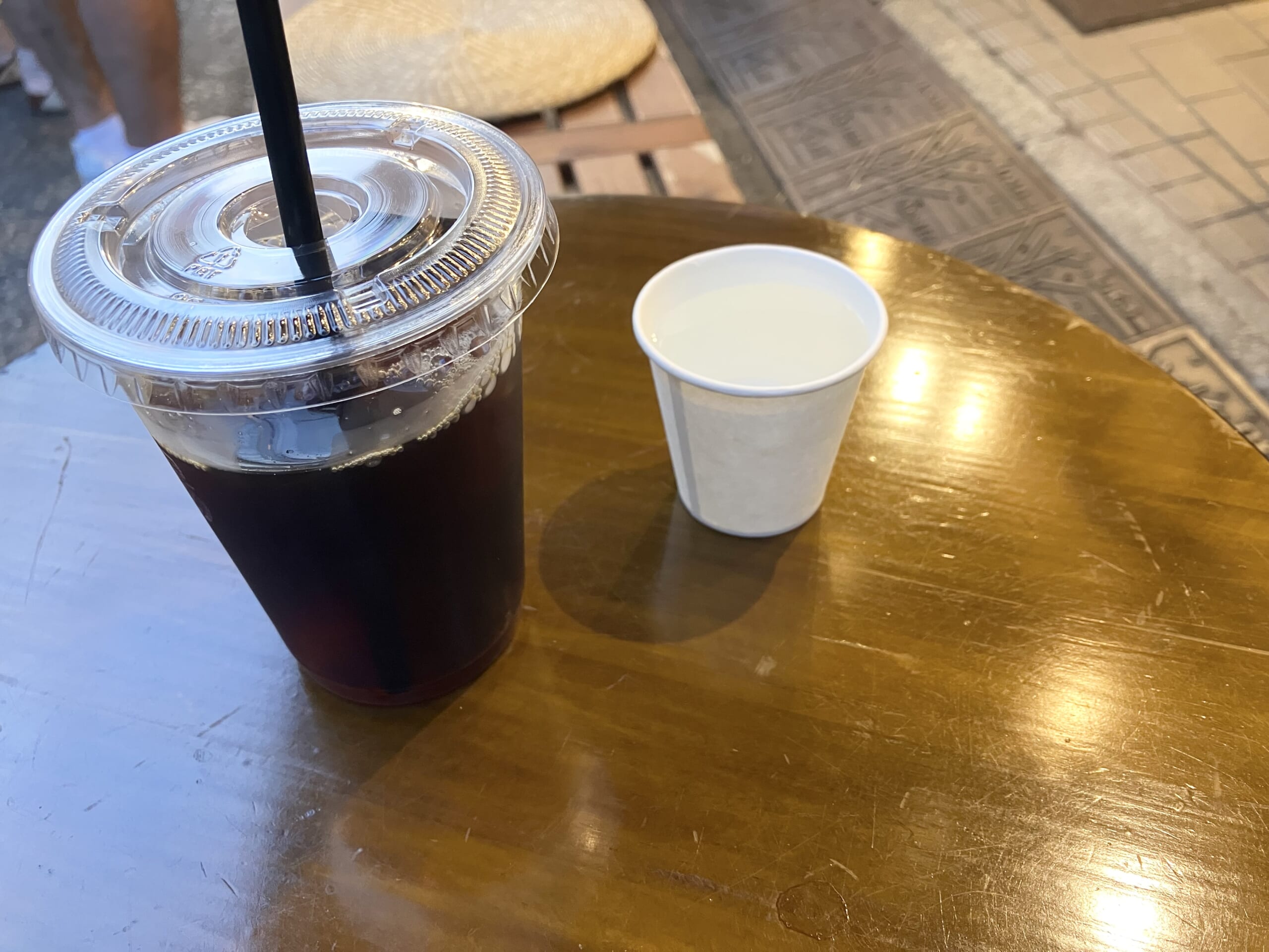 フラッペやレモンソーダなど、さまざまなメニューがあり悩みましたが、今回はオーソドックスにコーヒーをいただきます。暑い日だったのでアイスコーヒーにしました。
