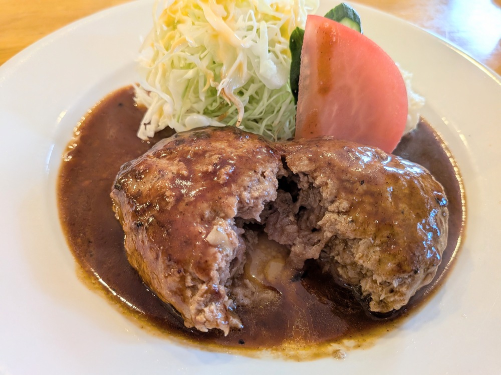 私はハンバーグデミソースを注文しました。ミニサラダ、漬物、ライス、お味噌汁がついていて、しっかり満足感のある定食スタイルでした。