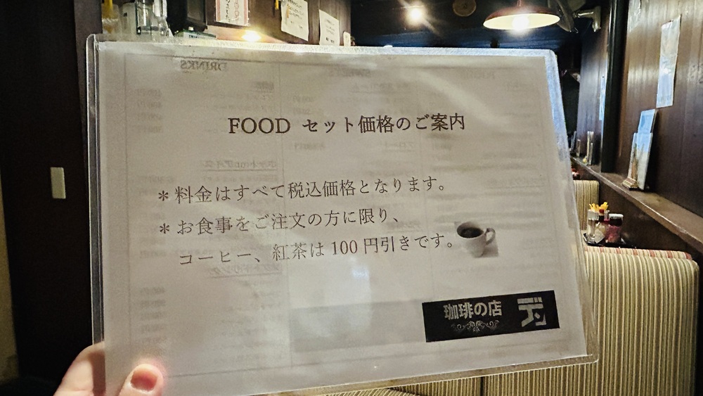 フードを注文するとコーヒー・紅茶は100円割引になるうれしいサービスもあります。今回はコーヒーを注文しました。