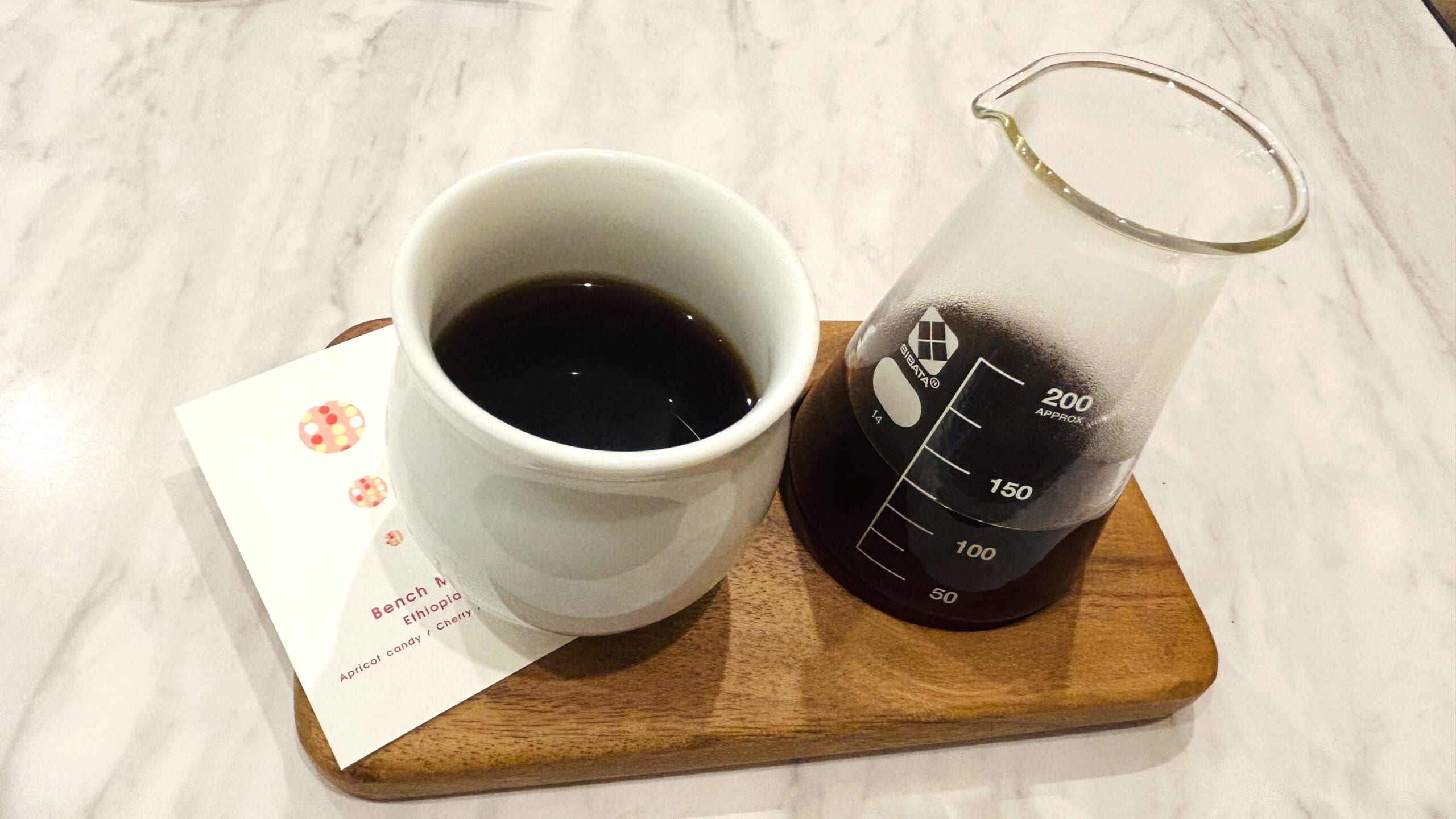 注文したコーヒーがやってきました。フレスコ型のビーカーにコーヒーが入っていて、手に収まる小さめのカップが添えられています。