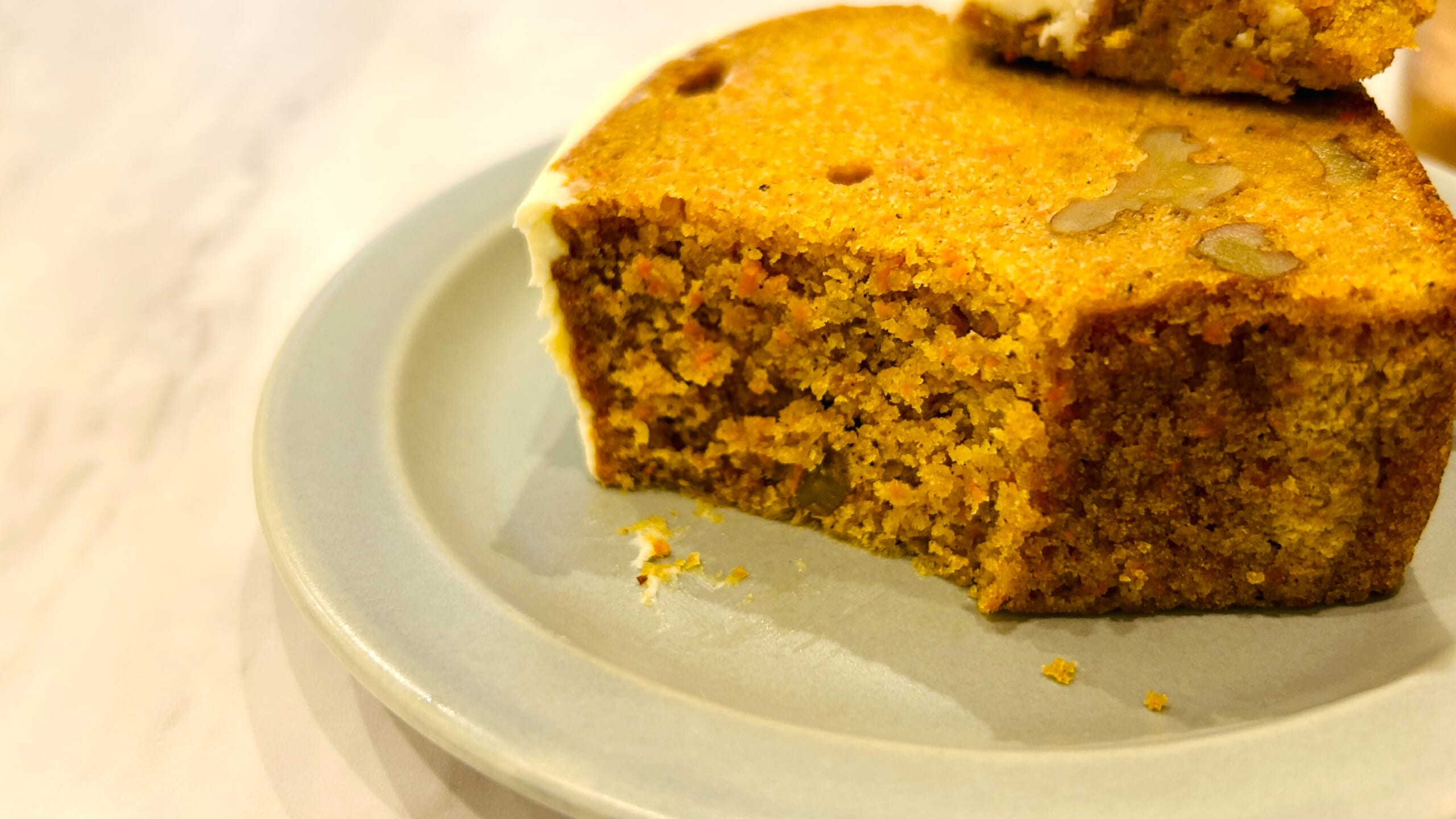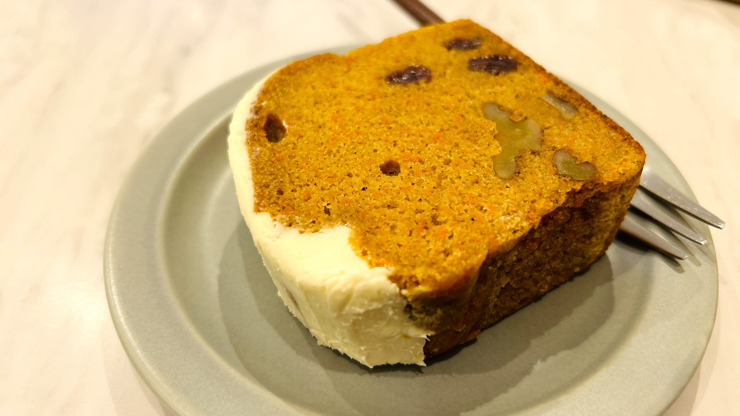キャロットケーキが来ました。想像以上に厚切りでボリュームがあります。重たいケーキかと思いきやスポンジはとてもしっとりしていて軽めのくちどけです。にんじんの甘みにクルミの香ばしさ、スパイスの香りが加わり、上のチーズフロスティングがちょうどよいアクセントになっています。