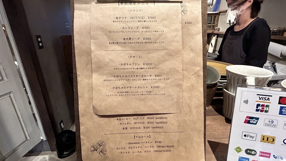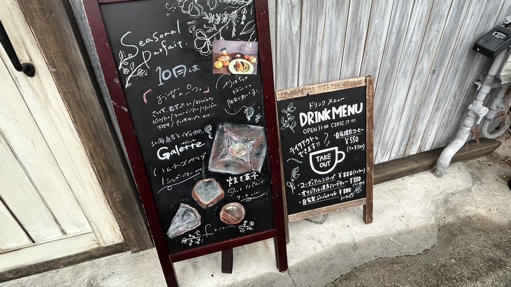 表の看板に出ていたのは季節のパフェの案内です。お芋のパフェが10月のメニューでした。ガレットは塩味系と甘い系の両方があります。タルトやパウンドケーキなどの焼き菓子もあります。スイーツの種類が多いのはうれしいですね。