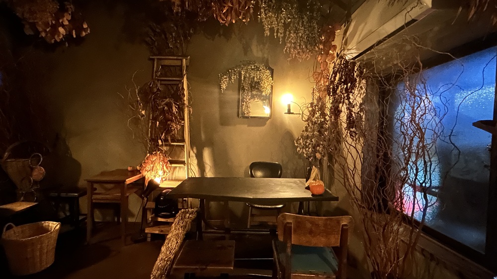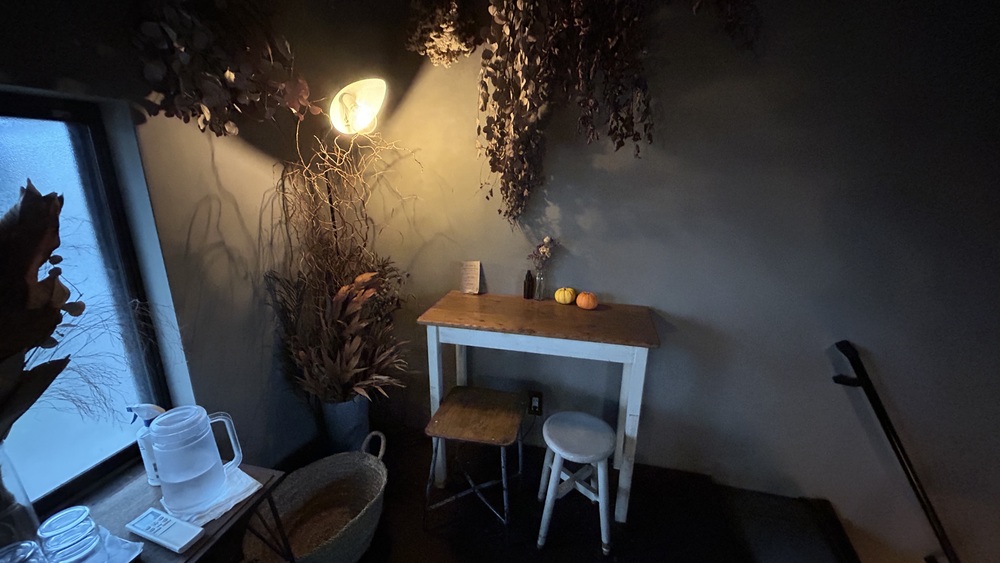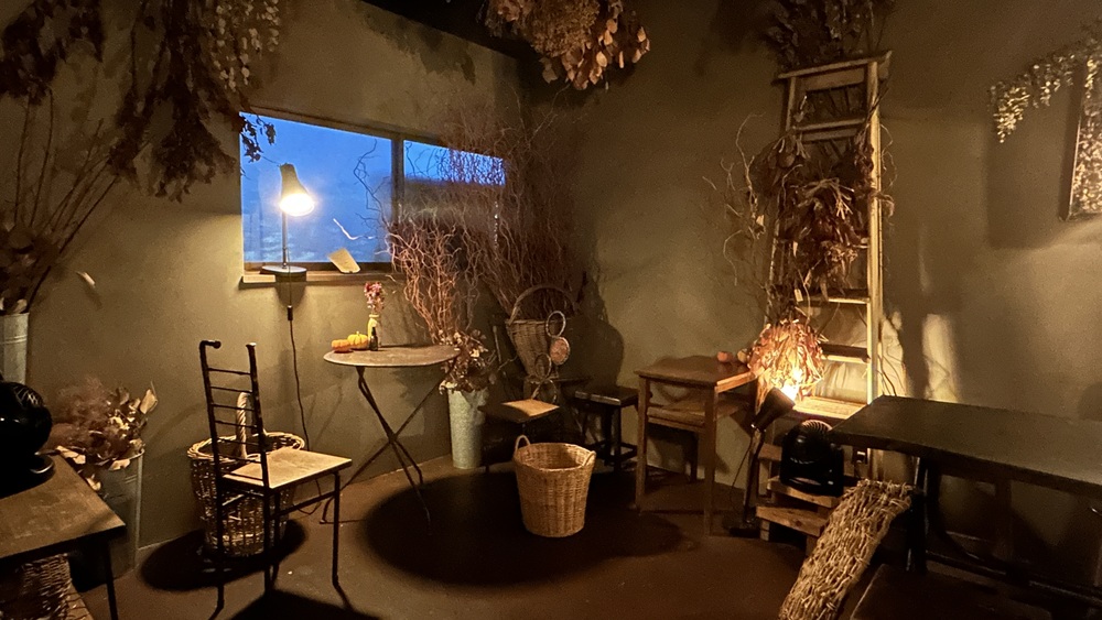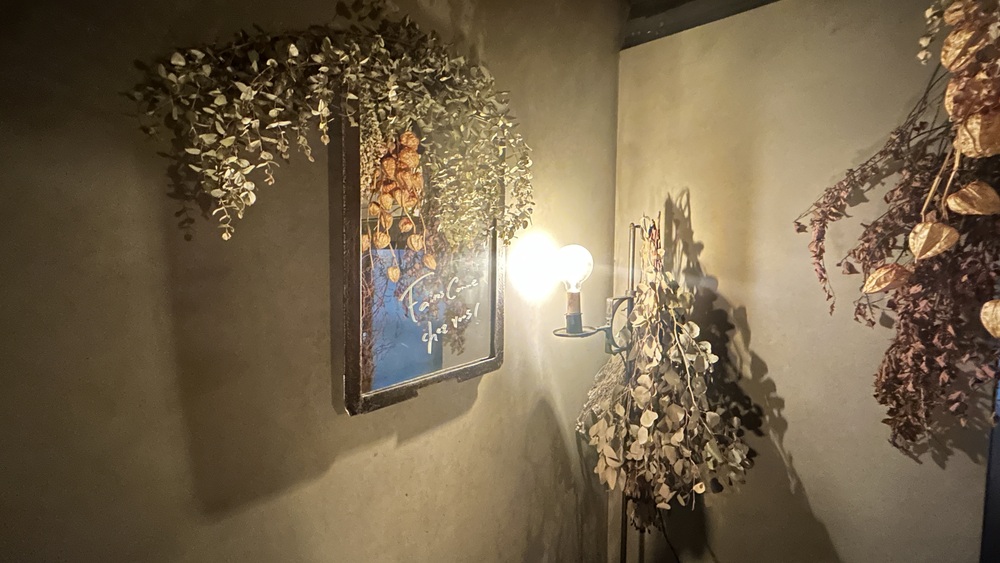 外からの濃い青の光の中に、ドライフラワーと鏡と灯り、やさしい木の色が織りなす世界です。思わずため息が出てしまうほどロマンティックです。