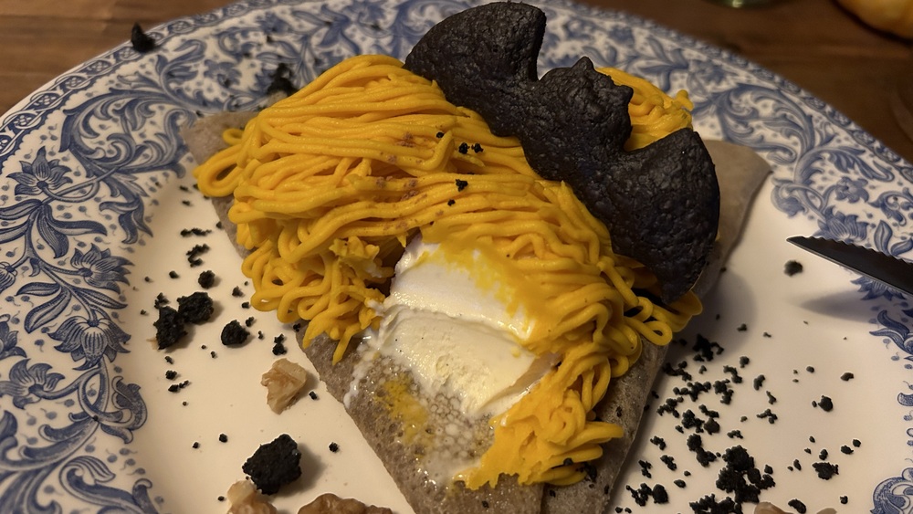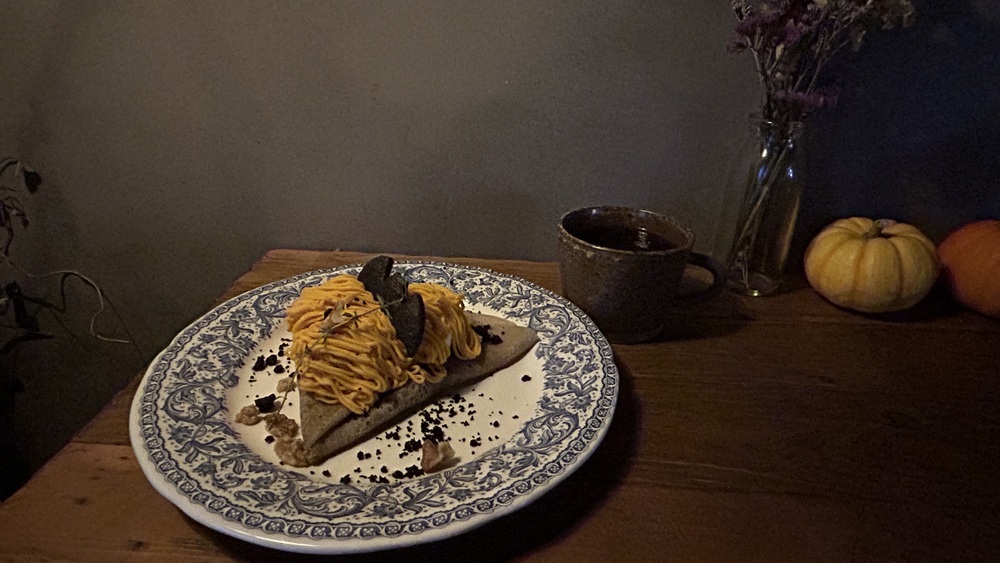 季節限定のかぼちゃのデザートガレットです。しっとりもっちりとしたガレット生地に、かぼちゃのクリームがたっぷりとかかっていて、上にはコウモリの形をしたダークココアクッキーがのっています。クルミとクッキーのクランブルが散りばめられていて、心地よい歯ごたえをプラスしています。