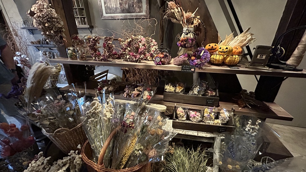 お店の中に入ると、たくさんのドライフラワーに圧倒されます。天井から下がったもの、壁沿いに装飾されたもの。生の花より少しくすんだ色の花たちは、思いっきりロマンティックでノスタルジック。少し暗めの灯りの中で、セピア色の空間を作っています。
