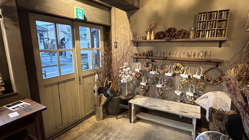 お店は2階建てで、1階には、テーブル席と会計カウンター、キッチン、ドライフラワーの販売スペースがあります。2階には、3つのテーブル席があります。
