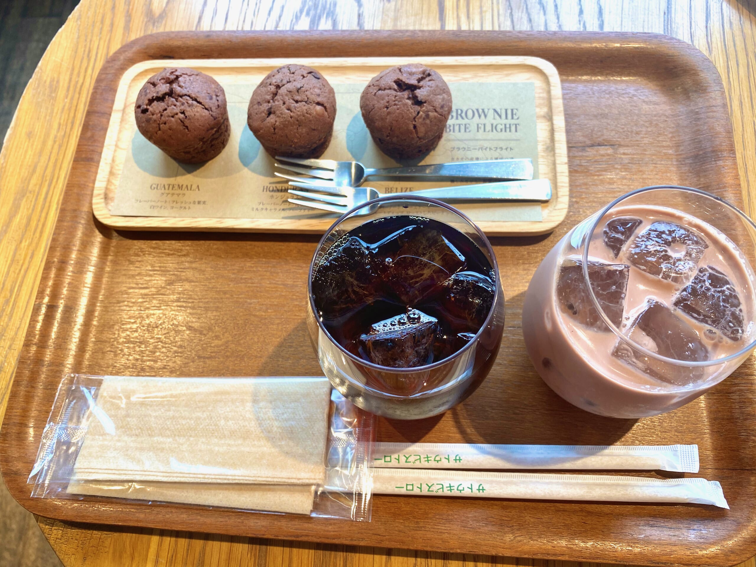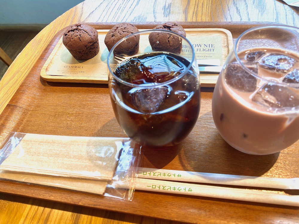 今回はランチ後に伺ったので、デザートとしてブラウニーバイトフライト(産地の異なるカカオを使用した3種のブラウニー)を注文し、相方とシェアしていただきます。