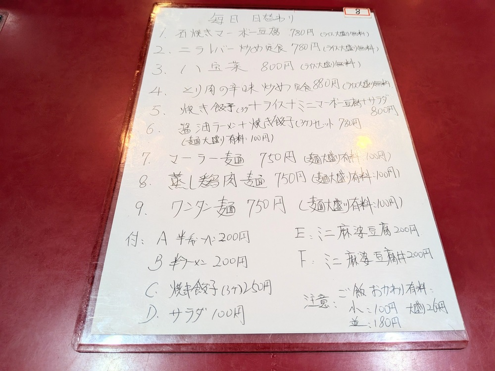 席に着くと、まず目を引くのは手書きのメニュー。味のある文字で書かれた定食や麺料理の数々に、どこかホッとする空気が漂っています。