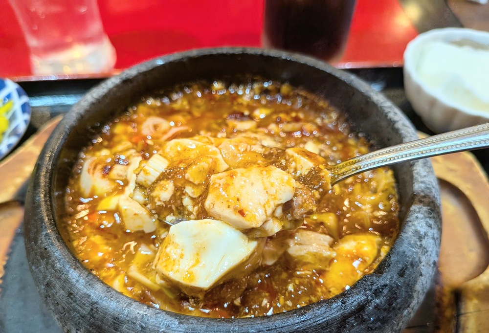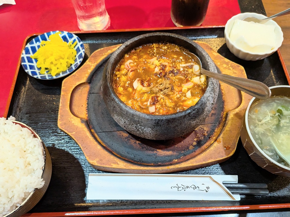 私が注文したのは「石焼きマーボー豆腐」です。グツグツと音を立てながら運ばれてきたその姿に、食欲が刺激されます。