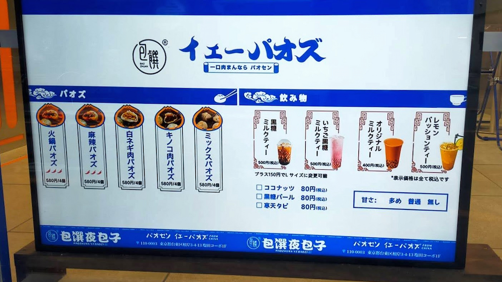 鶯谷駅の近くにある青い外観のちょっぴり派手なお店。お店の名前は包馔夜包子(パオセン イェーパオズ)です。