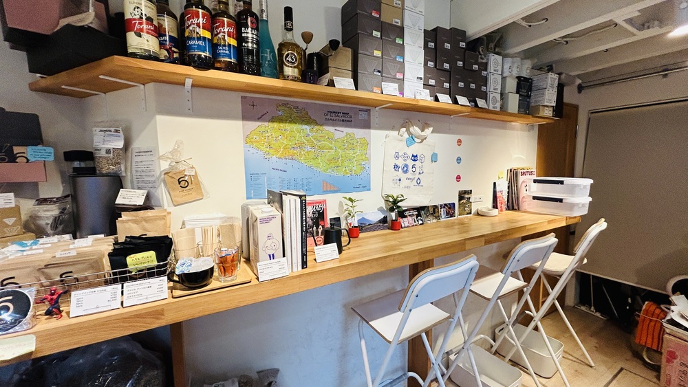 お客さん用カウンターの前には、小さなコーヒーグッズや本、生産地の地図などがあります。