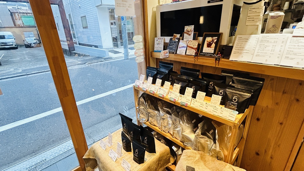本当にコンパクトなお店で、右側に大きな焙煎機、正面に3人が軽く腰かけられるお客さん用カウンター、左側には自家焙煎コーヒー豆の販売と、エスプレッソマシンやコーヒー器具が並ぶ店用カウンターがあります。