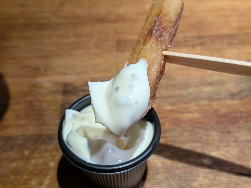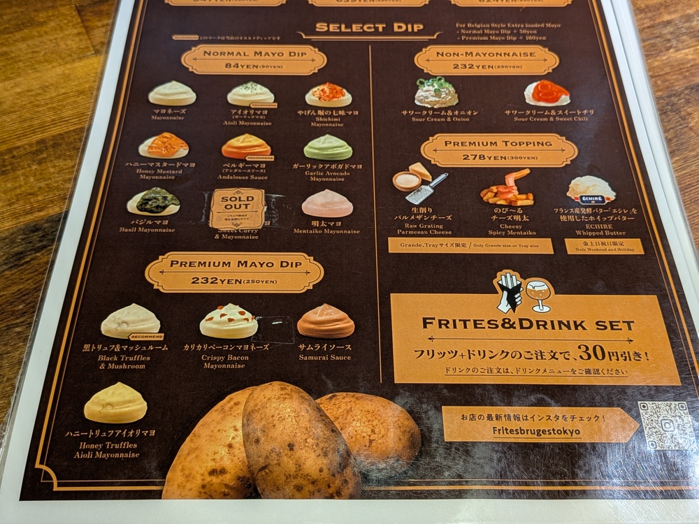 ディップは14種類、さらにチーズやバターなどのトッピングもあります。人気のディップは、アイオリマヨ、明太マヨ、黒トリュフ&マッシュルームだそうです。