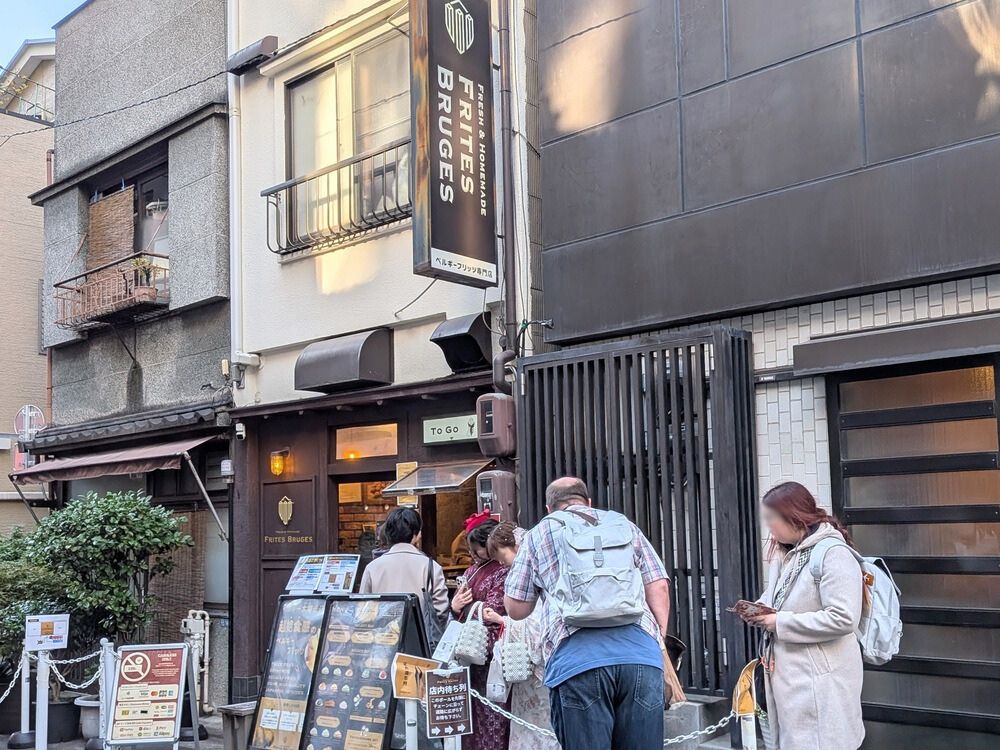 Frites Brugesの店頭には、外国人観光客、着物姿の女性客、カップルなど、さまざまなお客さんが並んでいました。