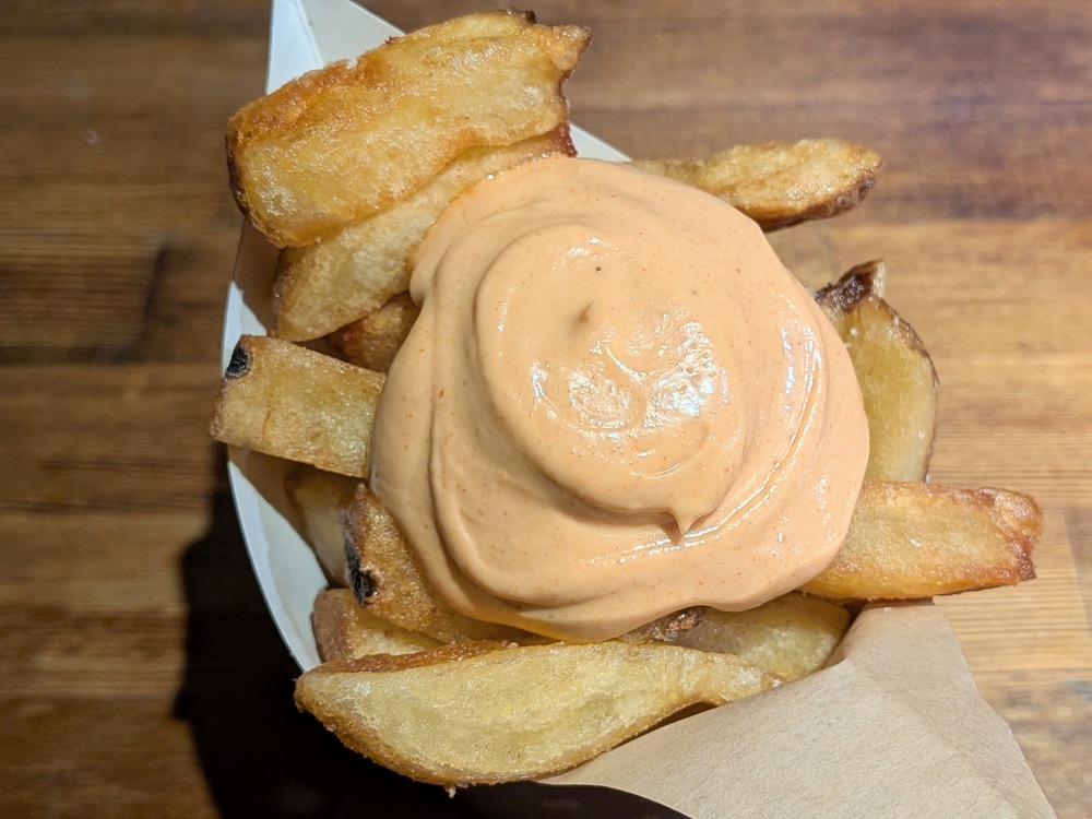 3種類あるサイズの中で1番小さいものですが、入れ物いっぱいにポテトが盛られています。その上にかかったベルギーマヨ(アンダルースソース)もたっぷり。
