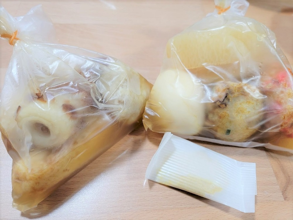 本日の晩ごはん用におでんを購入しました!たくさん注文しても、丈夫な袋に入れて、しっかり輪ゴムでとめてくれるので、漏れる心配はありません。からしは専用の紙にたっぷり付けてくれます。