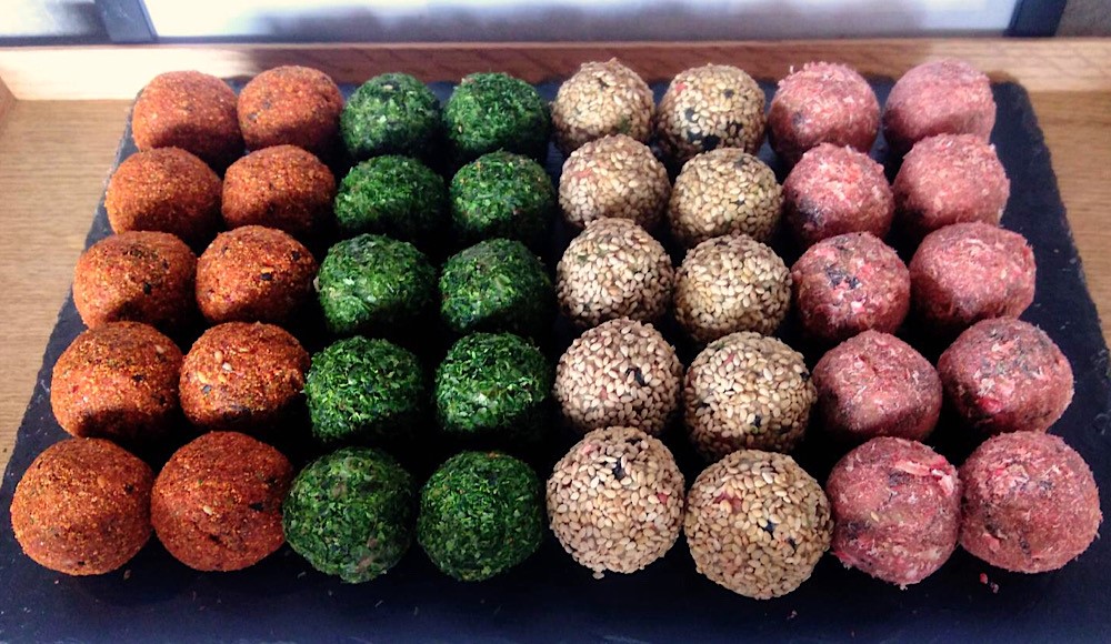 味は4種類。左から「七味」「青のり」「ごま」「桜えび」です。ころんとスイーツのようなかわいさですね。お店でタネから仕込み、1つ1つ丸めて手作りされています。