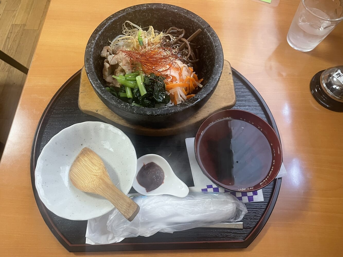 ビビンバをよそうためのしゃもじとお茶碗、わかめスープがついています。
