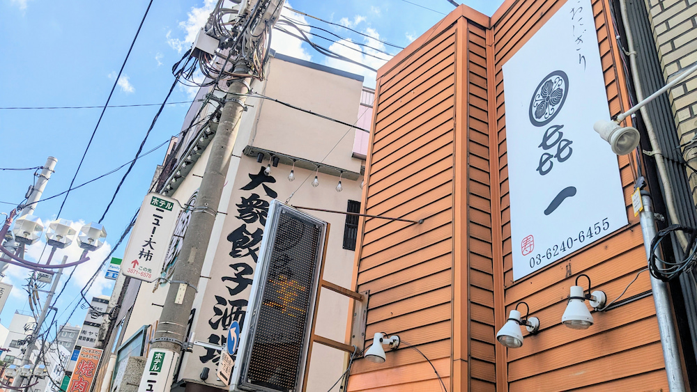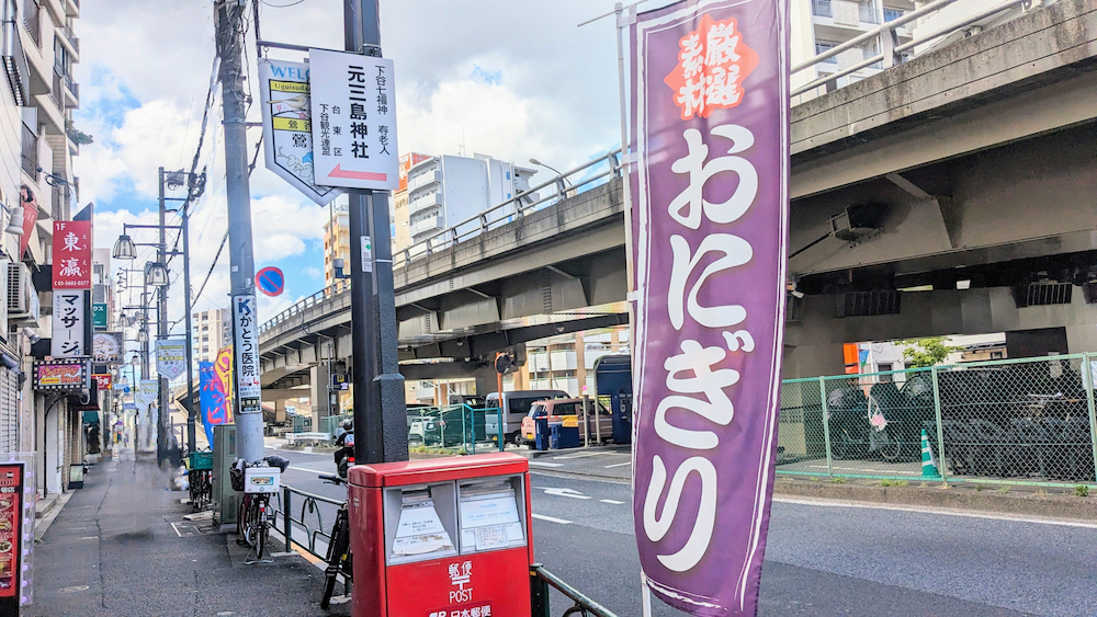 鶯谷駅の北口を出て、いろいろな飲食店が並ぶ通りを歩いていると大きく「おにぎり」と書かれた旗が見えました。