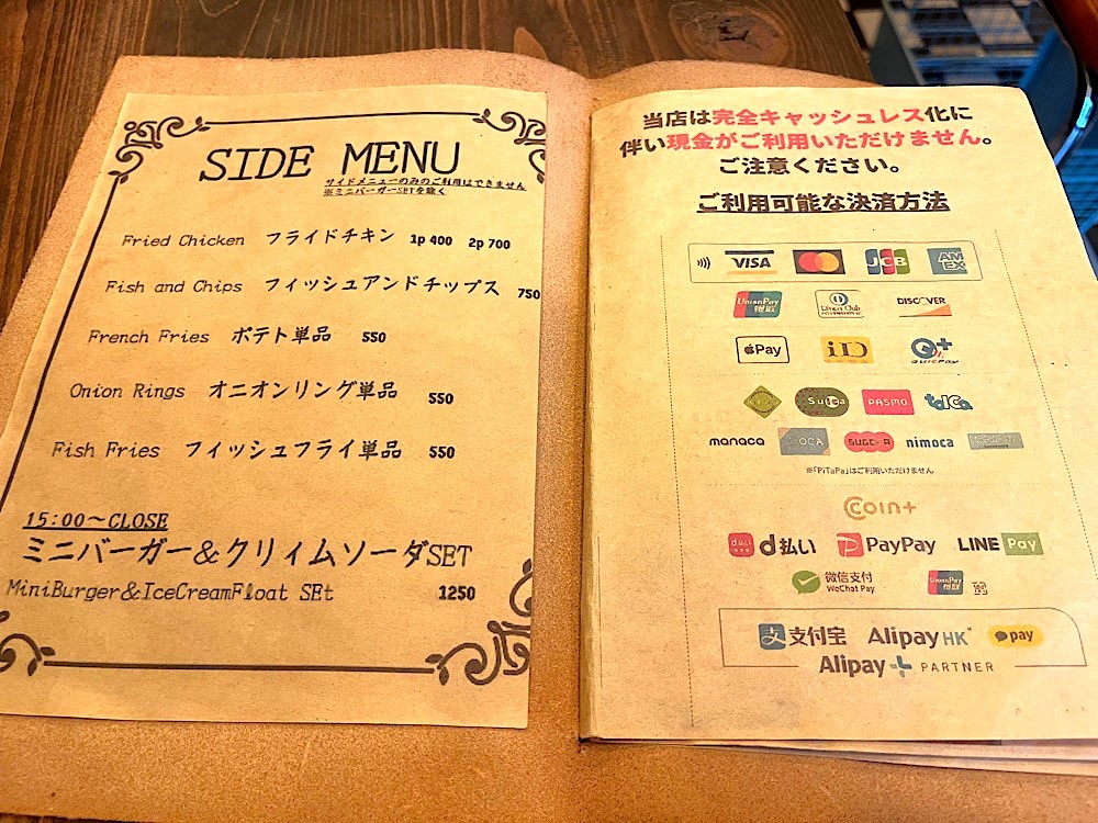 フィッシュアンドチップス、オニオンリングなど、おつまみにピッタリのサイドメニューもあるので、お休みの日や仕事が早く終わったときにもいいかも♪