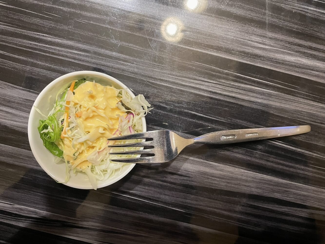 マヨネーズ感のあるドレッシングがかかっているミニサラダです。